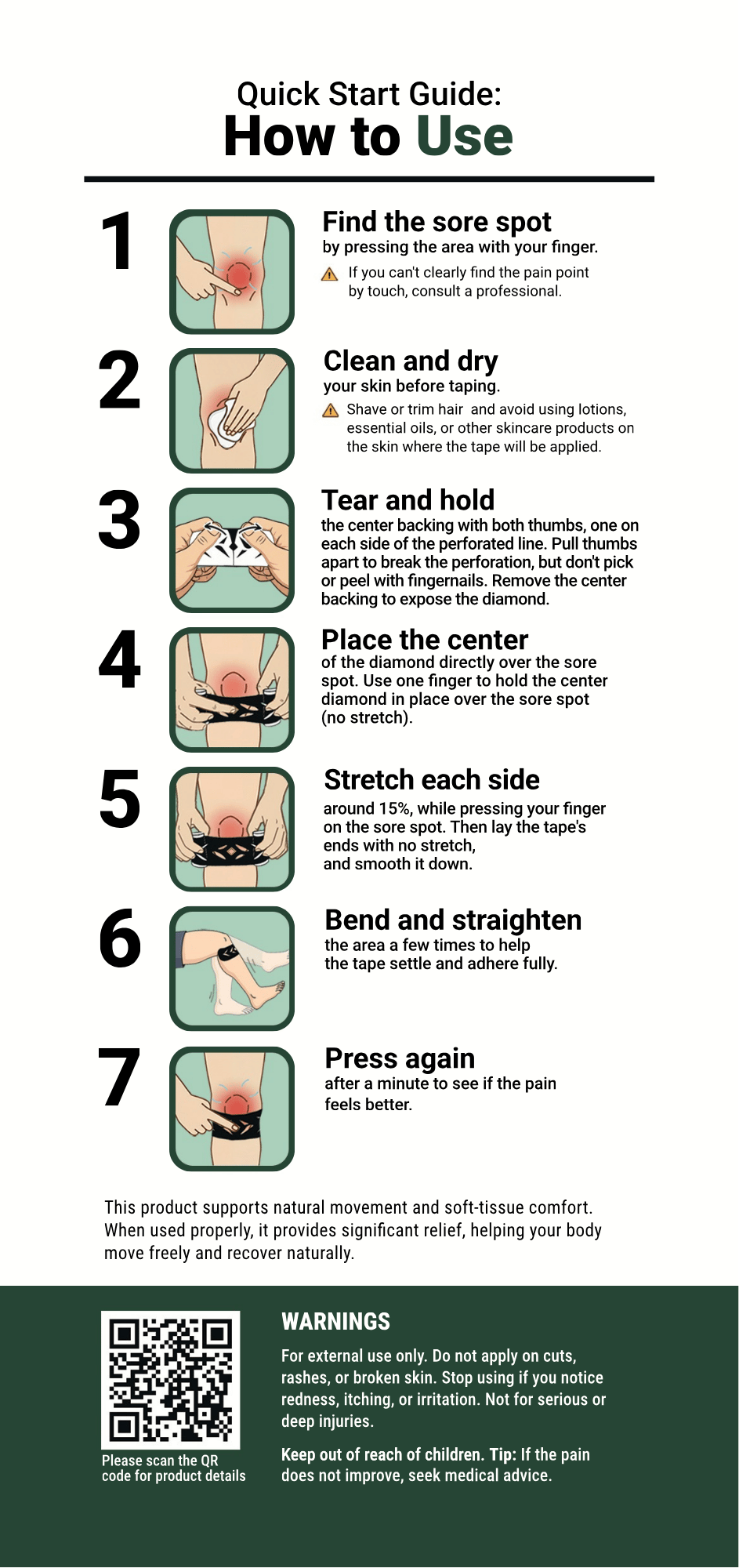 †Based on kinesiology taping principles used in physiotherapy practice and supported by academic research. These statements have not been evaluated by the FDA. This product is not intended to diagnose, treat, cure, or prevent any disease.